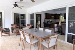 The open-concept living area flows seamlessly into a modern, fully equipped kitchen, ideal for preparing tropical meals or evening cocktails before heading out to explore.